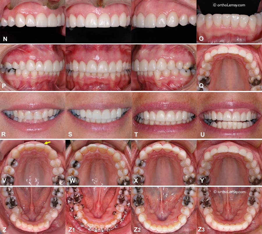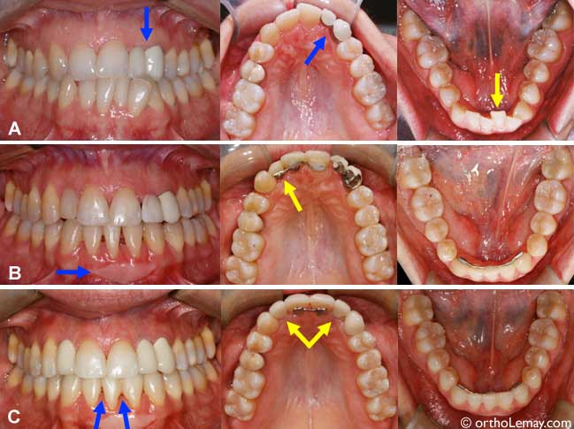 (A) Absence des 2 latérales supérieures. L’espace s’est fermé à droite et il y a un pont du côté gauche (flèche bleue). Une incisive inférieure a été extraite pour aligner les dents du bas (flèche jaune).