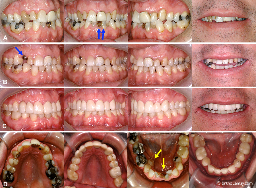 (C) Un implant et une couronne remplacent chaque latérale (flèches jaunes), une couronne a été faite sur la canine supérieure gauche, les espaces inter-dentaires ont été comblés par le dentiste avec du composite (flèches bleues).