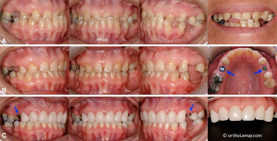 (B) À la fin des corrections orthodontiques; les dents antérieures sont dans une position plus fonctionnelles qui minimisera les chances d’usure à long terme. La mandibule est reculée en relation normale par rapport au haut. Les espaces édentés seront comblés par des couronnes sur implants. Les flèches indiquent les implants qui sont prêts à recevoir les couronnes.