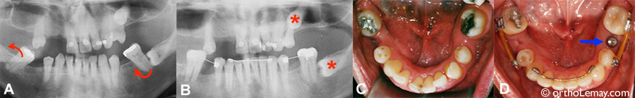 (D) Après les corrections, la position redressée des molaires permet la pose d’un implant.