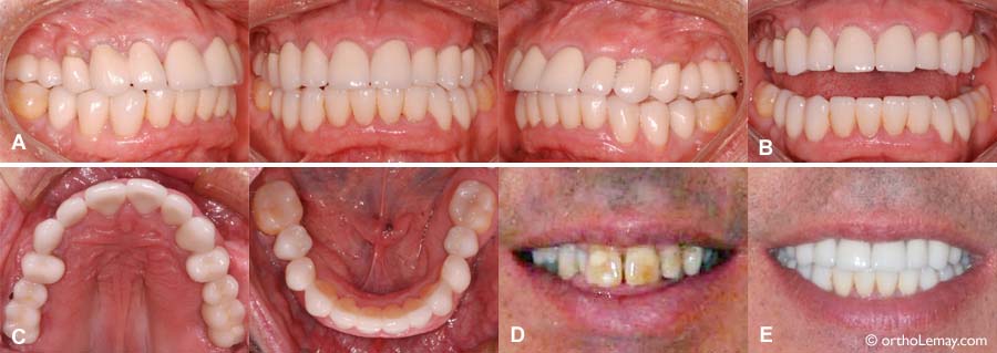 (A) Plus d’un an après la fin de l’orthodontie, les restaurations prosthodontiques sont complétées (couronnes, ponts, facettes). Toutes les dents ont été restaurées.