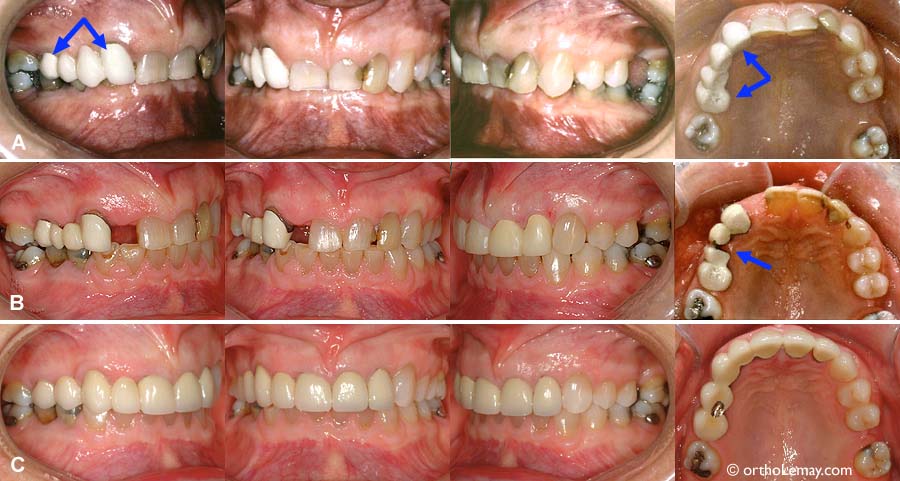 (B) Fin du traitement d’orthodontie. L’ancien pont a été coupé (flèche) pour permettre de reculer les dents et ouvrir un espace antérieur.