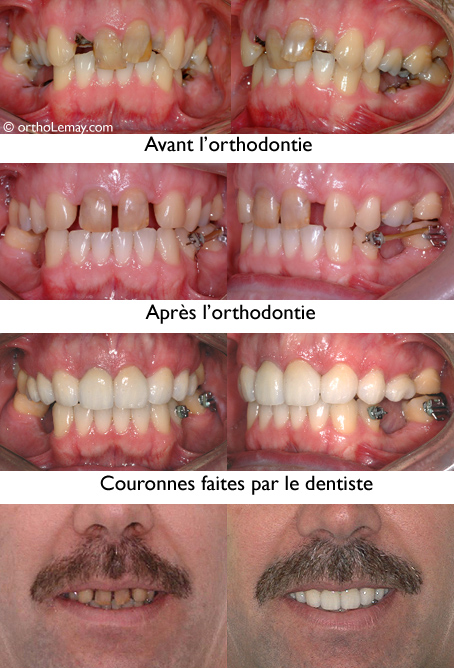 Adulte présentant une dentition “mutilée” (caries, dents fracturées et extraites). L’orthodontie a préparé la dentition pour que le dentiste puisse faire des restaurations adéquates.