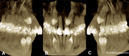 Images extraites d’une tomodensitométrie volumique à faisceau conique chez un jeune adolescent de 17 ans ayant ses 4 canines incluses. (A) Côté droit, (B) centre, (C) côté gauche. La vidéo ci-contre permet d’apprécier la complexité des malpositions de ces dents incluses. On peut voir que la canine supérieure droite cause une légère résorption de la racine de la latérale (voir flèche en mouvement).
