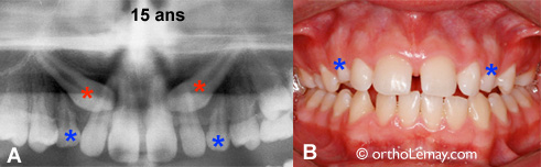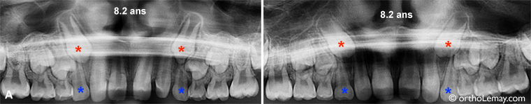 Ces 2 patients de 8 ans présentent une position des canines permanentes (* rouges) qui peut être favorablement influencée par des extractions sélectives (canines temporaires * bleus).