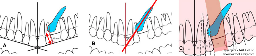 Méthodes de prédiction de l’inclusion des canines développées par Ericson et Kurol en évaluant (A) la position de la canine par rapport à des zones définies sur une radiographie panoramique, et (B) la distance de la pointe de la canine par rapport à un plan (occlusal). (C) Taux de succès d’autoéruption de la canine si la canine temporaire est extraite selon sa position par rapport à une ligne bissectrice tracée sur la latérale.