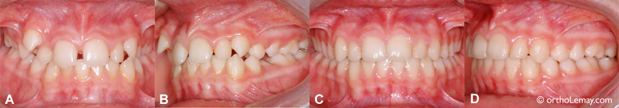 (A) Occlusion au début du traitement; les incisives supérieures sont inclinées vers l’intérieur et recouvrent complètement les dents inférieures et une partie de la gencive.