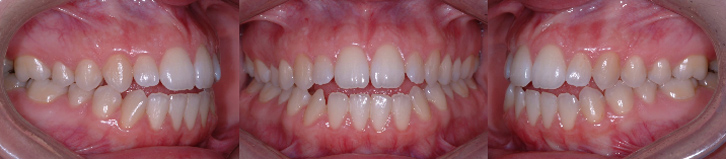 Malocclusion classe I chez une femme de 22 ans avec chevauchement dentaire et arcades étroites. (A) Avant le traitement, il manque d’espace dans la région antérieure; les incisives inférieures sont basculées vers l’intérieur. (B) Après les corrections, les arcades sont plus plus larges et les incisives plus droites.