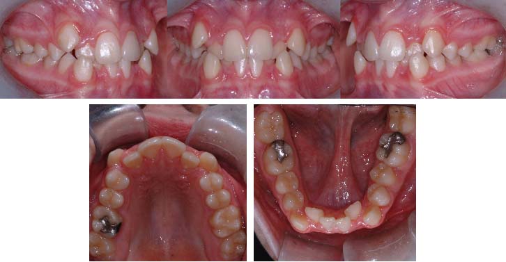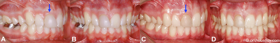 Fille de 12 ans avec chevauchement et arcade supérieure étroite. (A) Malocclusion avant le traitement. (B) Après le traitement sans extractions, l’arcade supérieure est plus large et le chevauchement dentaire est éliminé.