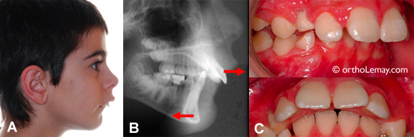 Les malocclusions Classe 2 division 1 sont principalement dues à une mâchoire intérieure reculée. Lorsque les incisives supérieures sont aussi avancées, ceci augmente l’écart entre les deux mâchoires. (A) Garçon de 12 ans avec mandibule reculée. (B) la radiographie montre la mandibule reculée et les incisives supérieures avancées.