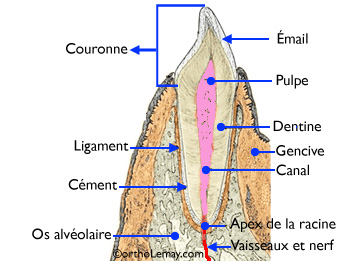 Illustration des différentes parties et composantes d’une dent (incisive inférieure) et du parodonte (os alvéolaire et gencive).