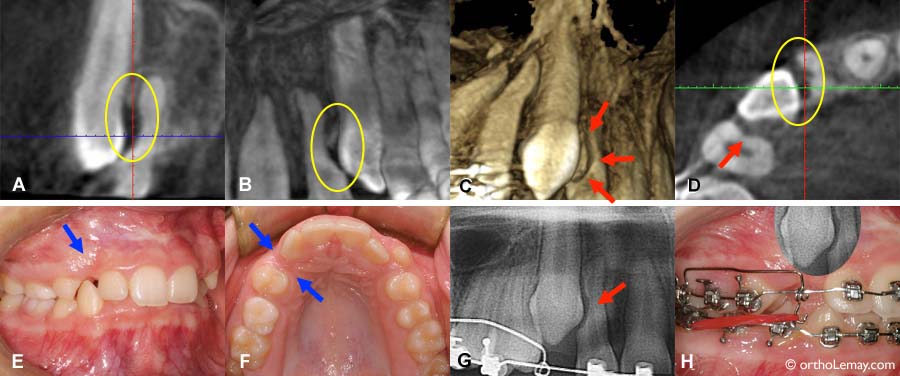(A, B, C) Différentes images générées à partir d’un scan 3D montrent le dommage que cause une canine incluse sur la racine de la latérale adjacente. (D) Une vue en coupe des racines montre l’étendue de la résorption dans la racine de la latérale (cercle jaune) et une zone concave dans la racine de la prémolaire (flèche). (E, F) Endroit où se situe la canine incluse. (G) L’usure sur la racine de latérale est visible de cet angle mais pas sur la racine de la prémolaire. (H) Une superposition de la photo et de la radiographie permet d’apprécier ce qui se passe sous la gencive.