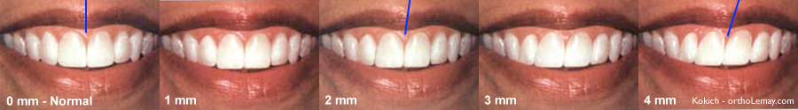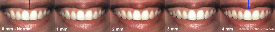 Figure 2 – Dans cette simulation, l’inclinaison des incisive a été modifiée de façon à déplacer la ligne médiane de 1, 2, 3 et 4 mm. La ligne bleue représente l’inclinaison des incisives.