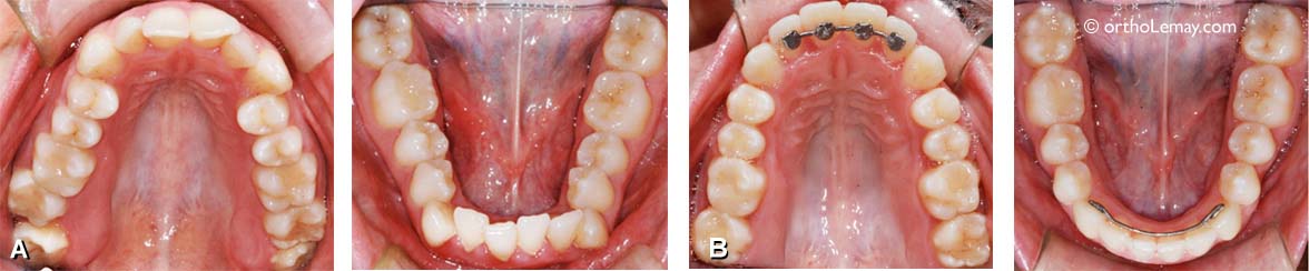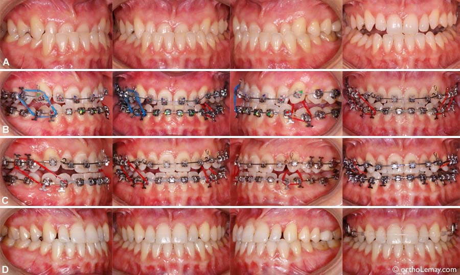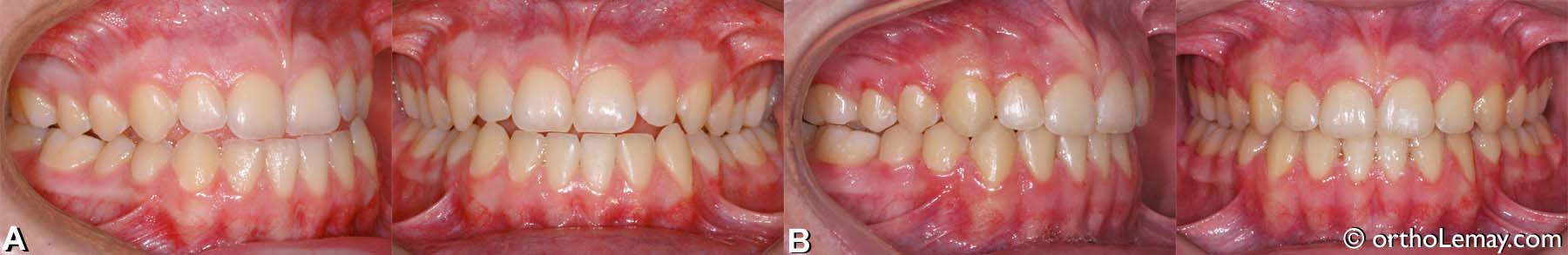 - (A) Adulte de 24 ans ayant des arcades étroites, du chevauchement dentaire sévère (manque d’espace) et une latérale en linguo-version (du côté du palais). Les premières molaires étant sévèrement endommagées, il fut décidé de les extraire (*) pour éviter la nécessité de faire des couronnes prothétiques et possiblement des traitements de canal plus tard.