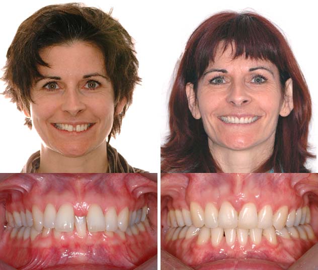 - (C et D) Après l’orthodontie, les espaces sont fermés (partiellement à droite), une nouvelle couronne plus esthétique a été faite sur la centrale qui est en meilleure position, les incisives inférieures sont visibles et le contour des gencives est plus uniforme, ce qui rend le sourire plus esthétique.