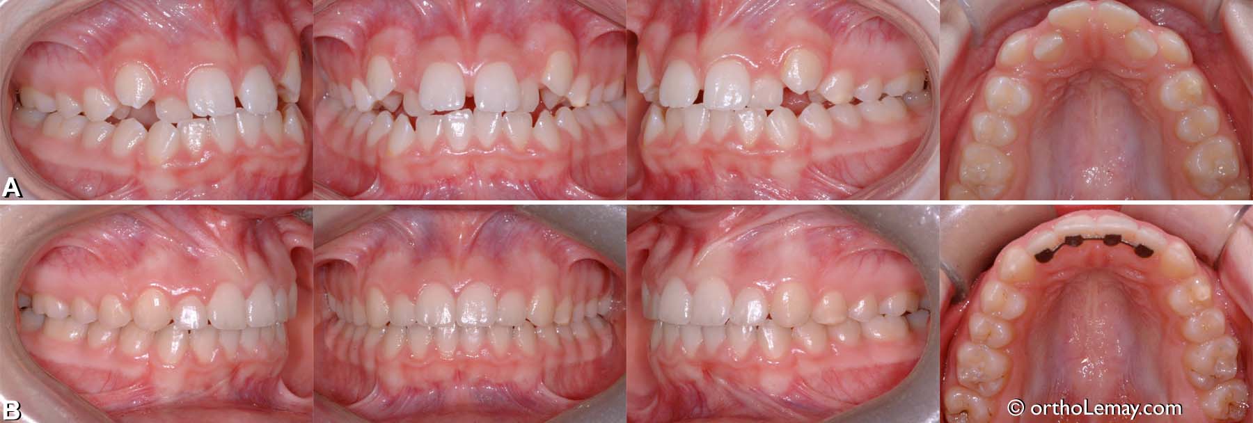 - (A et B) Malocclusion avant le traitement; des espaces importants sont présents et une couronne épaisse est présente sur une incisive supérieure.