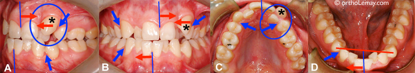 Les flèches rouges indiquent la direction de migration des lignes médianes et de la canine supérieure gauche (*) qui a avancé par-dessus l’incisive latérale.