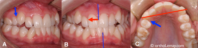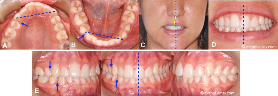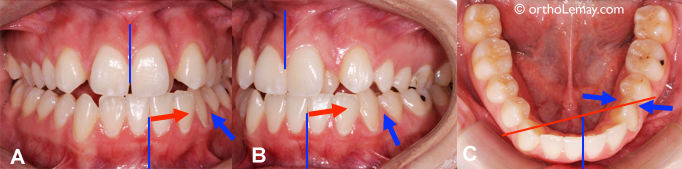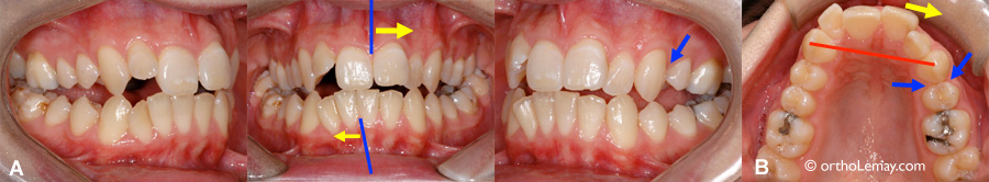 Malocclusion sévère (béance antérieure et postérieure, constriction maxillaire, chevauchement dentaire, asymétrie). Une prémolaire supérieure gauche fut extraite en bas âge (flèches bleues), les dents supérieures ont dévié de ce côté, exacerbant l’asymétrie de la ligne médiane (A et B – flèches jaunes et ligne rouge), n’améliorant aucunement la sévérité de la malocclusion, l’esthétique ou la fonction. Ce cas requiert toujours une intervention orthodontique majeure, mais l’orthodontiste doit en plus composer avec une asymétrie plus importante.
