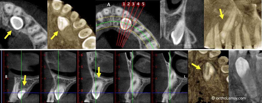 Exemple de clichés obtenus à l’aide d’une tomodensitométrie volumique tri-dimensionnelle pour localiser une canine incluse palatine (indiquée par les flèches). Ceci permet de s’assurer que la racine de la latérale n’est pas affectée par la dent incluse.