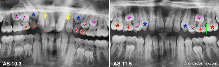 Extractions sélectives ayant permis d’améliorer la direction d’éruption des canines (*bleu) et premières prémolaires (*rose pâle) en 14 mois. Ces dents se sont redressées et on diminué les espaces entre les incisives (flèche jaunes) en faisant éruption. L’étape suivante à 11.5 ans serait d’extraire les secondes molaires temporaires (rouge) et de poser un mainteneur d’espace pour éviter la migration vers l’avant des premières molaires permanentes (*rouge).