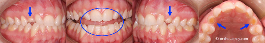 Extraction de 3 prémolaires (indiquées par les flèches), déviation des lignes médianes et migration incontrôlée des dents. Il y a autant de chevauchement dentaire et de problèmes d’occlusion malgré l’extraction de 3 dents qui “devaient régler le problème”. La canine supérieure gauche (*) est toujours aussi croche et manque d’espace malgré ces extractions!