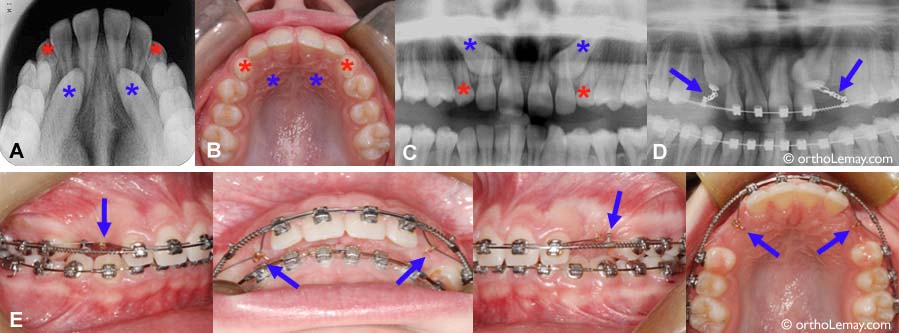 - (A) Une radiographie du palais montre la position anormale des canines (* bleu). Les canines temporaires sont toujours en place (* rouge) et ont probablement contribué à l’inclusion des canines pendant leur développement.
