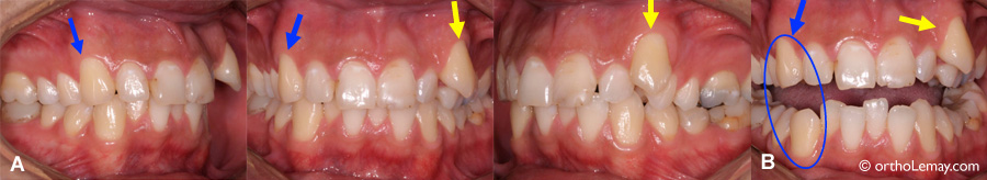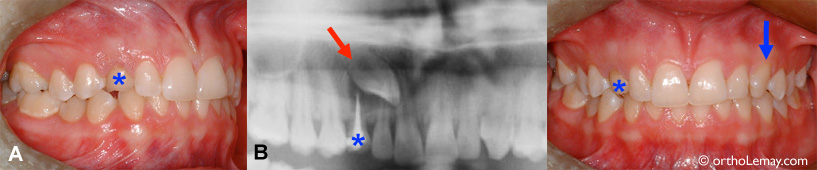 - En comparaison, la canine gauche est descendue normalement par elle-même (flèche bleue).