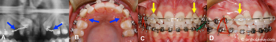 - (D) Les canines temporaires ont été extraites. Les boîtiers ont été posés pour aligner les dents et ouvrir l’espace nécessaire pour loger les canines. Des attaches de traction et chaînettes ont été collées sur les canines incluses. La traction est débutée et les canines commencent à se redresser à mesure qu’elles se dirigent vers l’arcade dentaire.