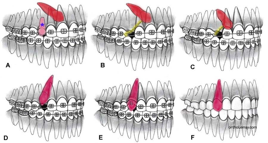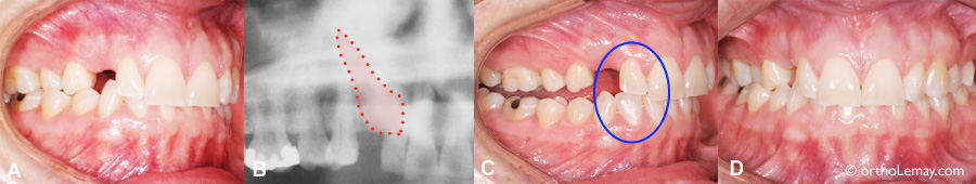 - Avec les années, la canine temporaire est tombée lorsque la canine permanente incluse a progressivement usé sa racine. Il en résulte un espace important et inesthétique où était la canine temporaire (* jaune).