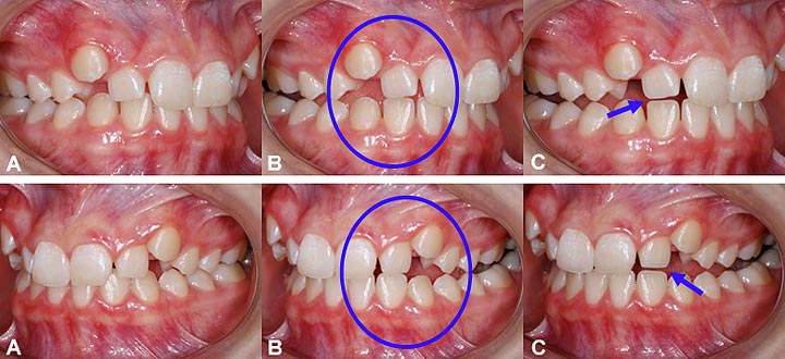 Canines supérieures incluses au palais chez une fille de 13 ans. Extraction des canines temporaires et traction orthodontique.