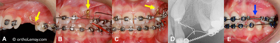 - (E) En bouche, tout ce qui est visible est le bout des chaînettes (flèches) dans lesquelles passe un fil flexible qui exerce une légère force de traction. À mesure que la canine descend, la chaînette sort de la gencive et sera progressivement coupée jusqu’à ce que la canine perce. À ce moment, une attache régulière (boîtier) sera collée pour compléter le déplacement des canines. Cela peut prendre de quelques mois à plus d’une année pour descendre des canines incluses jusqu’à leur position finale.
