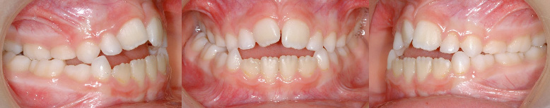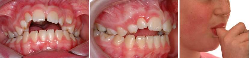 Exemple de l’effet à long terme sur la dentition. Jeune fille de 12 ans ayant sucé son doigt plusieurs années; béance antérieure, constriction et déformation de la mâchoire supérieure, dents supérieures avancées. La mastication et la phonétique sont affectées par cette malocclusion.