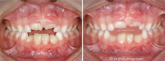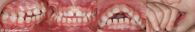 Exemple “typique” d’une habitude de suçage de doigt sévère; béance antérieure et constriction de l’arcade supérieure. Il commence a y avoir déformation de la mâchoire supérieure chez cette jeune fille de 6 ans. Il est indiqué d’enrayer cette habitude néfaste dès que possible pour minimiser les dommages.