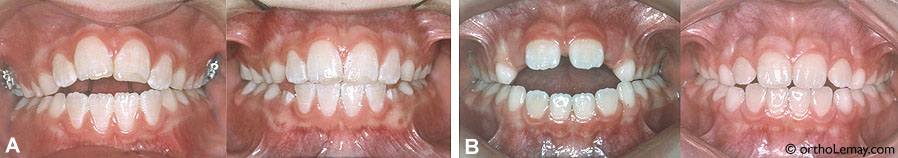 (B) 4 mois après le port d’un écran oral, il y a un surplomb entre les incisives supérieures et inférieures.